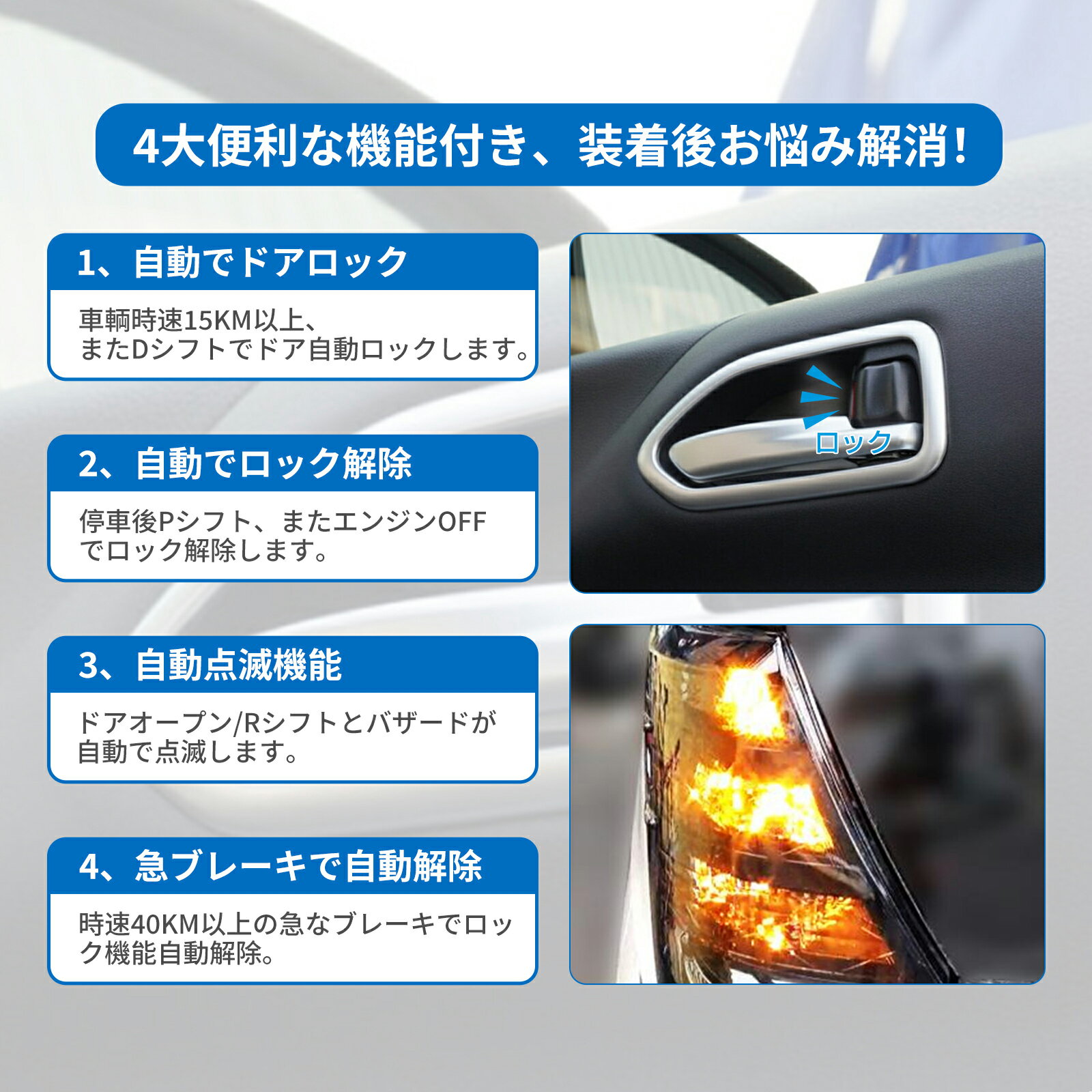 メーカー希望小売価格はメーカーカタログに基づいて掲載しています 商品仕様 商品特徴 11機能搭載! 1、スマートキー ドアロック長押しで4枚の窓が同時に閉まる。 2、スマートキードアアンロック3回押し、3回目を長押しで4枚の窓が同時に下がる。 3、ドアを開けるとウインカーが点滅。 4、バックに入れるとウインカーが点滅。 5、時速15km/hまたはDシフトでドアロック(設置可能)。 6、Pシフトまた...